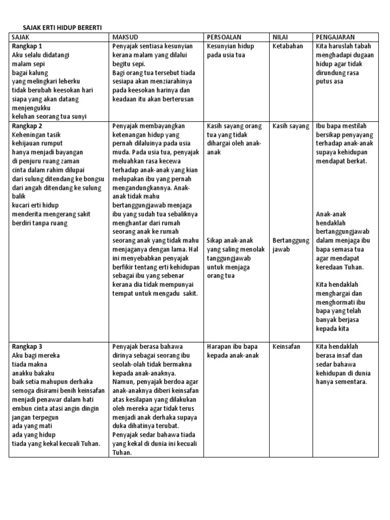 Maksud Sajak Komsas Tingkatan 5 SAJAK MAKSUD Aku selalu didatangi malam sepi bagai kalung yang melingkari leherku tidak berubah keesokan hari siapa yang akan datang menjengukku keluhan seorang tua sunyi Penyajak sentiasa kesunyian kerana malam yang dilalui begitu sepi. I perulangan bunyi vokal a - Aku selalu didatangi rangkap 1 baris 1 iiperulangan bunyi vokal i - Semoga disirami benih keinsafan rangkap 3 baris 5 iiiPerulangan bunyi vokal u -anakku bakaku rangkap 3 baris 3. SAJAK ERTI HIDUP BERERTI SAJAK ERTI HIDUP BERERTI.