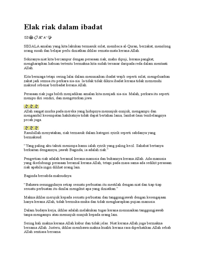 Antara ciri-ciri riak dan sombong yang ada pada diri mereka ialah. Ikhlas tidak dapat kita paksakan sebab bila kita memaksakan diri kita untuk menerima suatu ketentuan namanya juga memaksakan diri ya tentu saja akan menjadi terpaksa. Sūraṯ al-Ikhlāṣ atau Sūraṯ al-Tawḥīd adalah surah ke-112 dalam al-Quran.