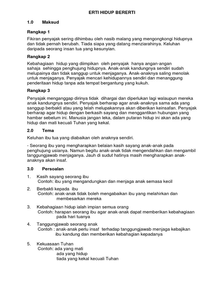 Maksud Rangkap Persoalan Gaya bahasa Unsur Bunyi Bentuk Nilai dan Pengajaran. Kesunyian hidup yang dirasai oleh seorang tua. Kasih sayang orang tua yang tidak dihargai oleh anak-anak.