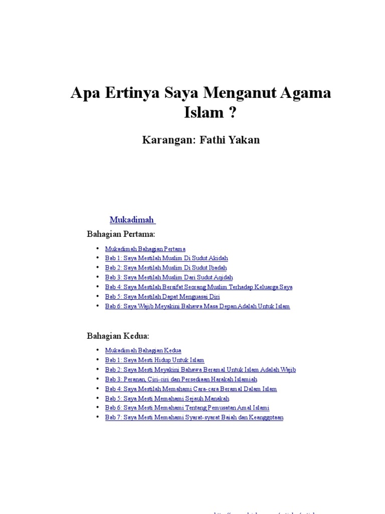Apa Artinya Saya Menganut Islam. Maksud Islam ialah Agama ciptaan Allah yang lengkap lagi sempurna dengan segala peaturan dan undang-undang yang merangkumi penyususnan kehidupan manusia baik yang mengenai orang perseorangan kekeluargaan kemasyarakatan dan kenegaraan sekaligus menghubungkan manusia dengan Tuhan dan manusia dengan alam sejagat bagi menjamin kesejahteraan keselamatan. Bahagian pertama buku ini bertajuk Apa Ertinya Saya Menganut Islam membentangkan sifat-sifat penting yang wajib ada pada seseorang bagi membolehkan ia menjadi seorang Muslim dalam erti kata yang sebenarnya.